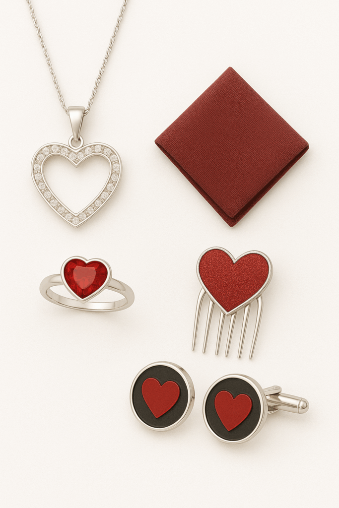 Oblek či smoking by mohl být ideálně doplněn jemným „prvkem lásky“ – například vínovým nebo červeným kapesníčkem, decentní ozdobou na klopě nebo manžetovými knoflíčky s romantickým motivem. Tyto detaily mohou být drobné, ale měly by působit stylově a elegantně.